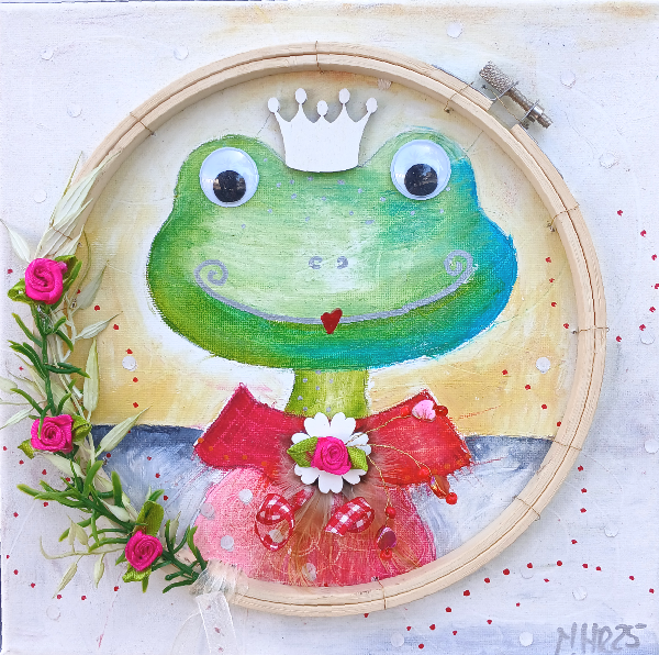 Bild K27, 25 x 25 cm, Öl auf Leinwand, Stickrahmen, Wackelaugen, Krönchen, Federn und vieles mehr, 29 €, zuzüglich Versandkosten