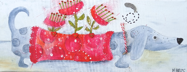 Bild J76, 20 x 50 cm, Öl auf Leinwand und diveres Material, in der Handtasche sitzt ein kleiner Hund, 45€, zuzüglich Versandkosten